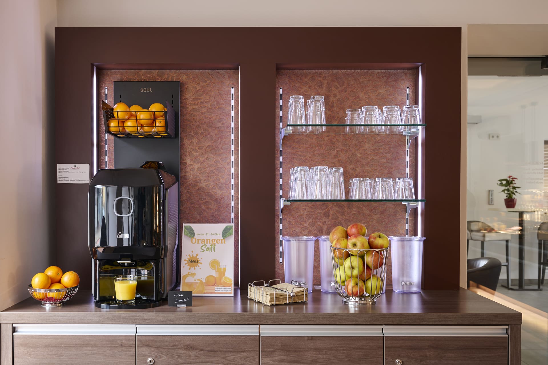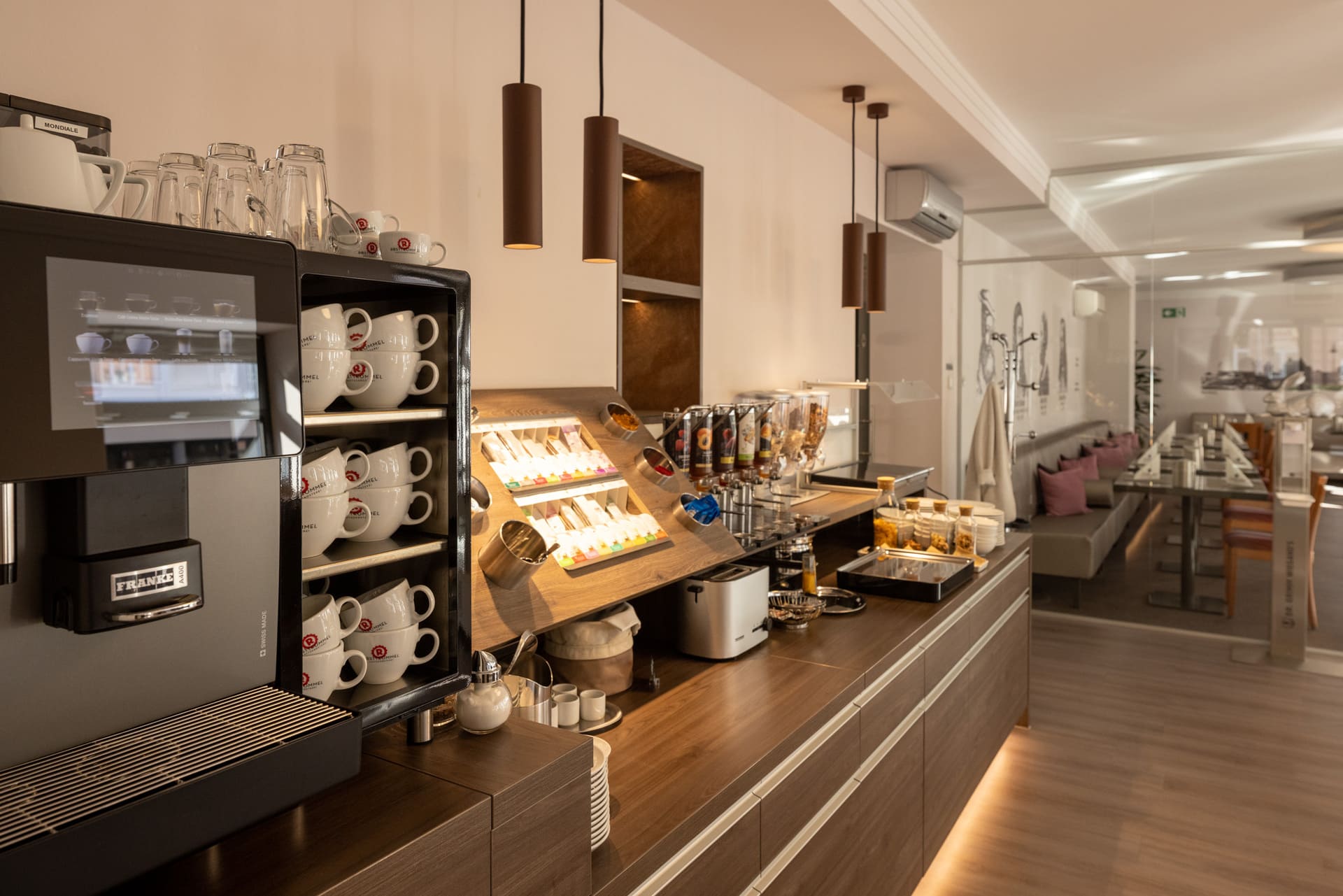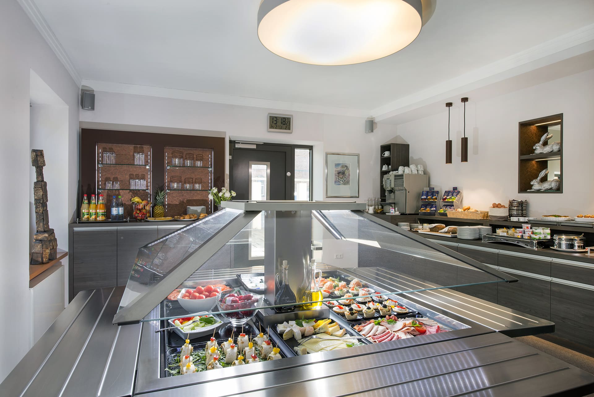 In unserem modernen Frühstücksraum erwartet Sie ein kulinarisches und reichhaltiges Buffet.